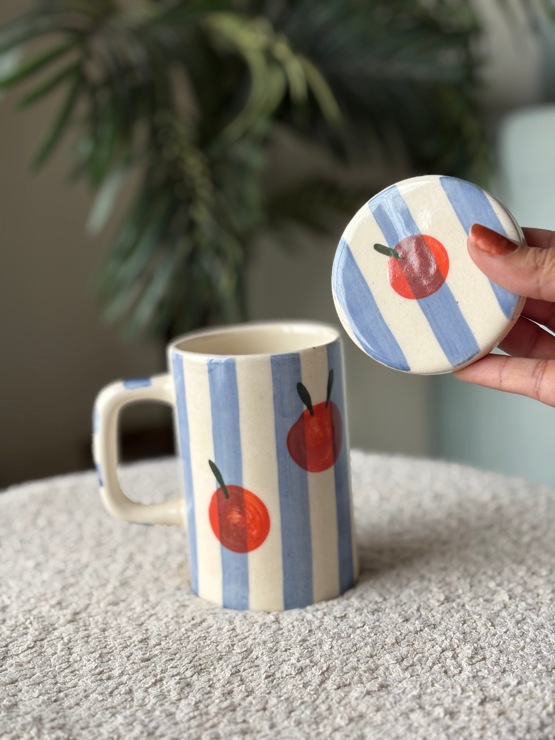 Handcrafted with love, these tall ceramic mugs come with matching lids and the sweetest hand-painted fruit details β a pink striped strawberry for her and a blue striped mandarin for him (or vice versa, we donβt judge π).